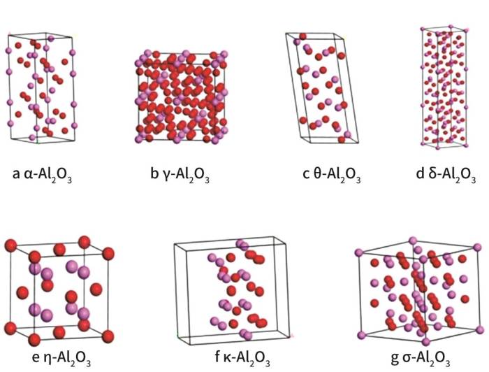 国内发现的无水氧化铝的晶型有九种以上,其中最常见的是α-Al2O3、β-Al2O3、γ-Al2O3、θ-Al2O3、δ-Al2O3、η-Al2O3、κ-Al2O3、σ-Al2O3、ρ-Al2O3、χ-Al2O3。